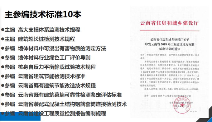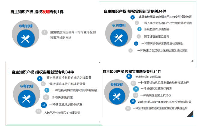 獲評”云南省知識產(chǎn)權(quán)優(yōu)勢企業(yè)”榮譽稱號,是上級對云南合信公司科技成果的肯定,也是公司重視科技創(chuàng)新的重要體現(xiàn)。云南合信公司始終把創(chuàng)新作為引領(lǐng)企業(yè)發(fā)展的第一動力,一直非常重視知識產(chǎn)權(quán)對企業(yè)效益的提升作用,高位推進(jìn)技術(shù)創(chuàng)新工作。截止目前,公司申報自主知識產(chǎn)權(quán)專利44件(含發(fā)明專利3項),已授權(quán)35件(含發(fā)明專利1項)。新立科研項目6個,在研項目12個,已出成果10項。公司主參編技術(shù)標(biāo)準(zhǔn)10本,其中主編地標(biāo)2本,參編國標(biāo)1本、行標(biāo)1本、地標(biāo)6本。2020年,公司新申報主編地方標(biāo)準(zhǔn)《高大支模體系監(jiān)測技術(shù)規(guī)程》和《建筑超長樁檢測技術(shù)規(guī)程》已通過立項審查,并已啟動編制工作;參編《墻體材料中可浸出有害物質(zhì)的測定方法》、《墻體材料行業(yè)綠色工廠評價導(dǎo)則》已完成報批;參編地方標(biāo)準(zhǔn)《云南省建筑抗震支吊架檢測及施工驗收技術(shù)規(guī)程》已完成所負(fù)責(zé)章節(jié)的編寫工作。