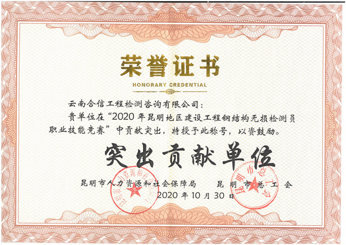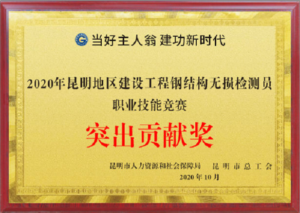 同時(shí),我司作為技術(shù)支持單位協(xié)助云南省工程檢測協(xié)會(huì)舉辦了2020年昆明地區(qū)建設(shè)工程鋼結(jié)構(gòu)無損檢測員職業(yè)技能競賽活動(dòng)。此次技能競賽選拔出了一批技藝精湛、善于解決技術(shù)難題的技術(shù)尖兵,不僅使檢測機(jī)構(gòu)有效地判斷自身鋼結(jié)構(gòu)無損檢測的水平,取長補(bǔ)短,也促進(jìn)昆明市地區(qū)建筑工程檢測行業(yè)鋼結(jié)構(gòu)檢測整體水平的提升。在此次技能競賽活動(dòng)中我司提供了大力支持、表現(xiàn)突出,因此獲得了由昆明市人力資源和社會(huì)保障局、昆明市總工會(huì)頒發(fā)的突出貢獻(xiàn)獎(jiǎng)獎(jiǎng)牌和榮譽(yù)證書。