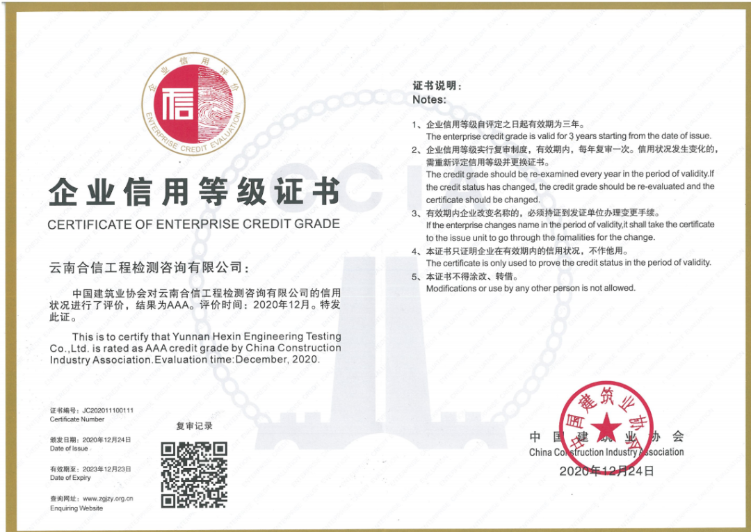 為進一步增強企業(yè)競爭力,加快企業(yè)信用體系建設(shè),云南合信工程檢測咨詢有限公司根據(jù)中國建筑業(yè)協(xié)會質(zhì)量管理與監(jiān)督檢測分會《關(guān)于開展2020年度建筑業(yè)AAA級信用企業(yè)(檢測機構(gòu))評價推薦工作的通知》要求,積極組織開展評價籌備工作;近日,中國建筑業(yè)協(xié)會質(zhì)量管理與監(jiān)督檢測分會發(fā)布通知,我司榮獲由中國建筑業(yè)協(xié)會頒發(fā)的AAA級企業(yè)信用等級證書。