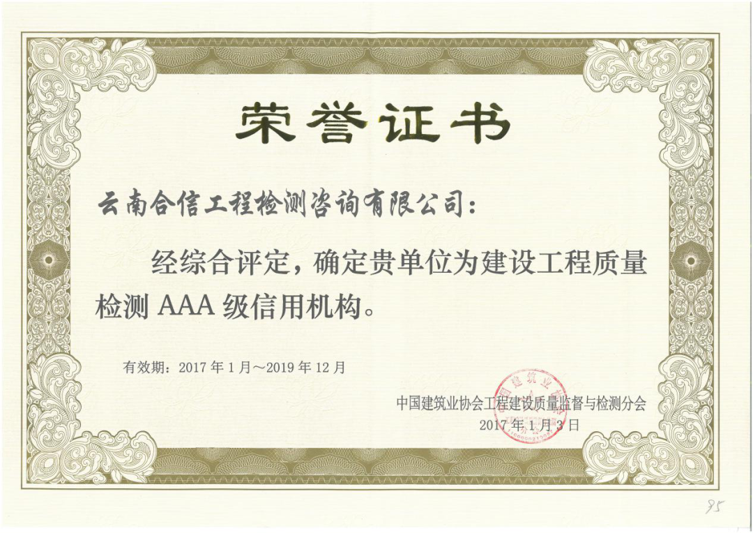 本次獲評是我司在2017年首次獲得建設(shè)工程質(zhì)量檢測AAA級信用機構(gòu)的基礎(chǔ)上再次獲得此項評價。多年來,我司秉承”質(zhì)量第一、誠信為本、用戶至上”宗旨,立足云南,面向西南,以一流服務(wù)、一流質(zhì)量、一流信譽,誠信、及時、準(zhǔn)確服務(wù)于我省工程建設(shè)質(zhì)量檢測;以先進的檢測設(shè)備和雄厚的技術(shù)實力,科學(xué)、求實、公正服務(wù)于經(jīng)濟社會發(fā)展,深得各界信賴,廣受社會好評;同時致力于發(fā)揮全省工程檢測機構(gòu)誠信自律的示范帶頭作用,積極履行社會責(zé)任,先后榮獲:”全國建設(shè)工程質(zhì)量檢測行業(yè)先進單位”、”云南省建設(shè)工程質(zhì)量檢測行業(yè)先進單位”、”云南省能效測評機構(gòu)”、”高新技術(shù)企業(yè)”、”昆明市技術(shù)中心”、”云南省知識產(chǎn)權(quán)優(yōu)勢企業(yè)”等榮譽。