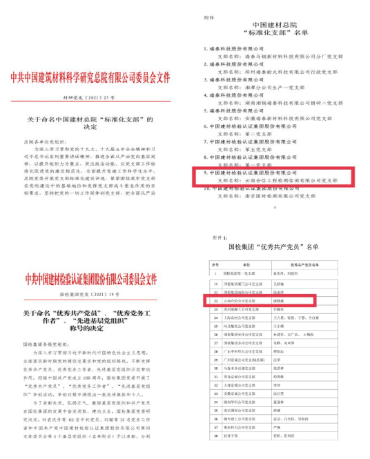 近日,根據(jù)中共中國建筑材料科學(xué)研究總院有限公司委員會印發(fā) 《關(guān)于命名中國建材總院“標(biāo)準(zhǔn)化支部”的決定》,云南合信工程檢測咨詢有限公司黨支部榮獲中國建材總院 “標(biāo)準(zhǔn)化支部”稱號,支部黨員潘曉鑫獲國檢集團“優(yōu)秀共產(chǎn)黨員”榮譽稱號。