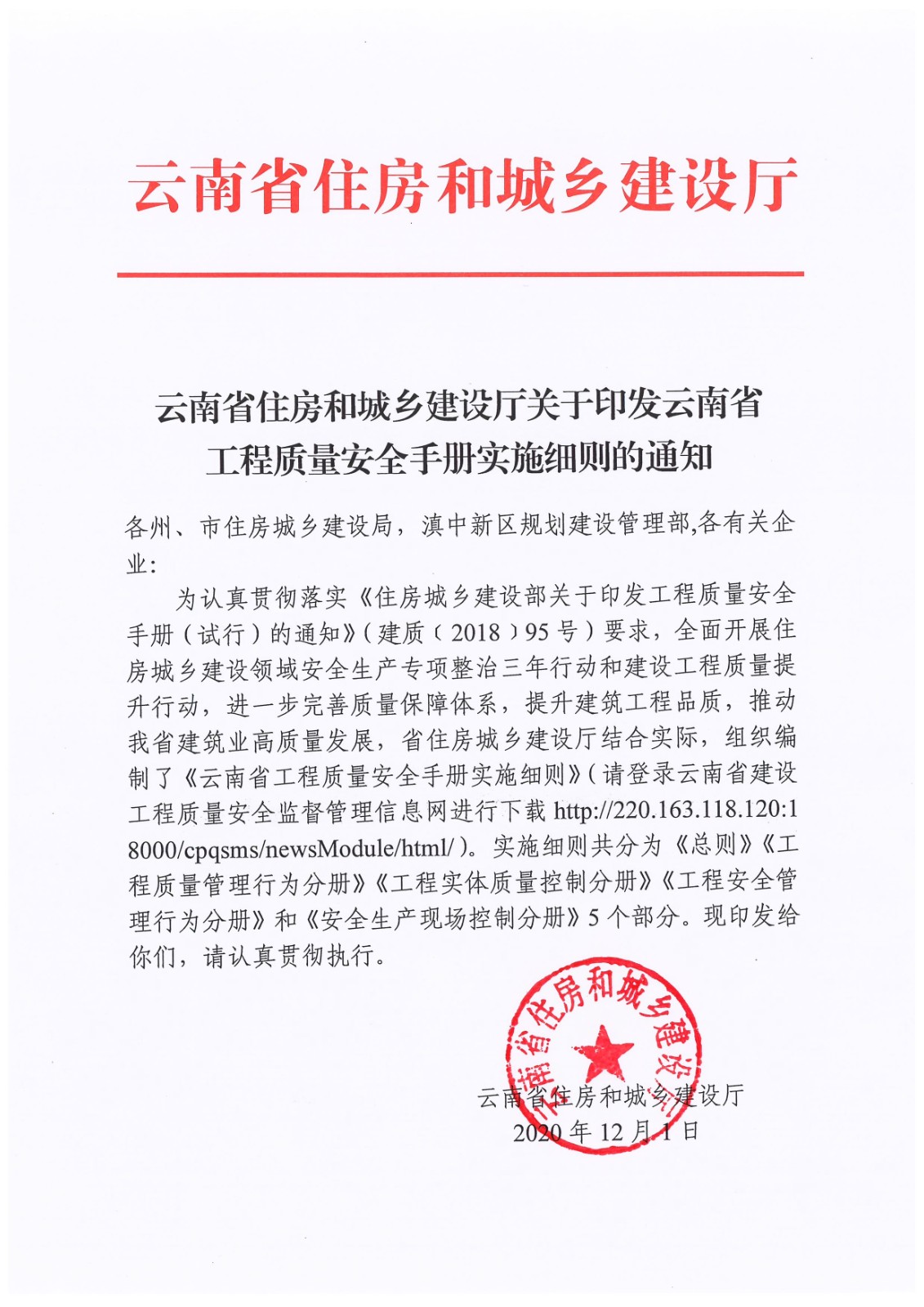 云南省住房和城鄉(xiāng)建設(shè)廳關(guān)于印發(fā)云南省工程質(zhì)量安全手冊實(shí)施細(xì)則的通知