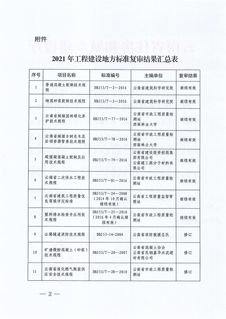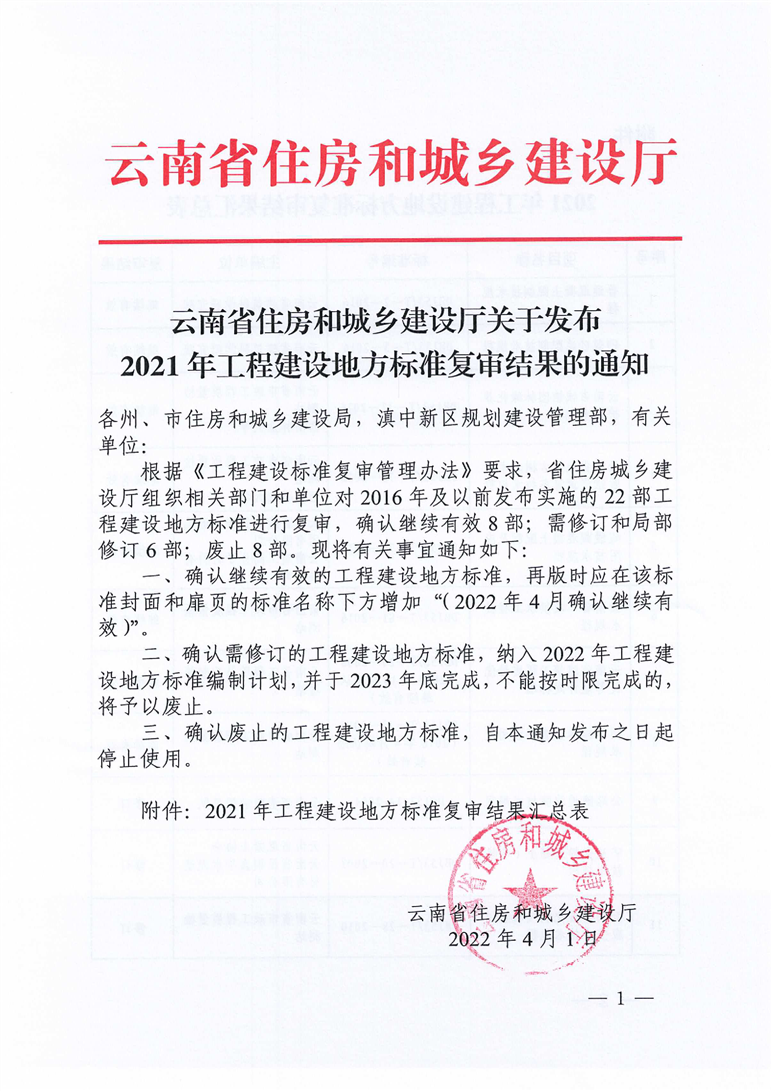 云南省住房和城鄉(xiāng)建設廳關于發(fā)布2021年工程建設地方標準復審結果的通知