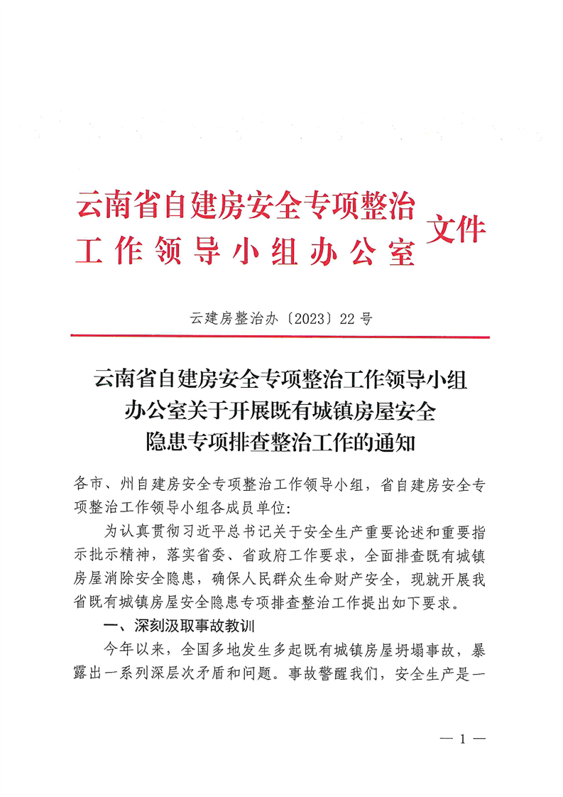 云南省自建房安全專(zhuān)項(xiàng)整治工作領(lǐng)導(dǎo)小組辦公室關(guān)于開(kāi)展既有城鎮(zhèn)房屋安全隱患專(zhuān)項(xiàng)排查整治工作的通知